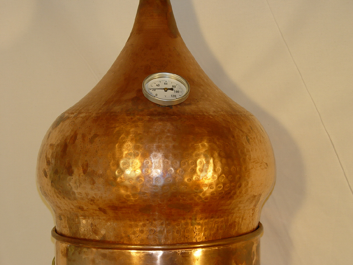 Der Hut ist der eigentliche Destillieraufsatz und die Formen sind so vielfältig wie die Bezeichnungen dafür. Wichtig ist hierbei eigentlich nur, das der Hut dem aufsteigenden Dampf ausreichend Platz lässt um sich frei zu entfalten und der Weg bis ins Geistrohr leicht zu finden ist. Vor allem bei Destillationen bei denen es aufs Aroma ankommt, sollten Sie es dem Dampf nicht allzuzschwer machen seinen Weg bis in das Geistrohr zu finden.