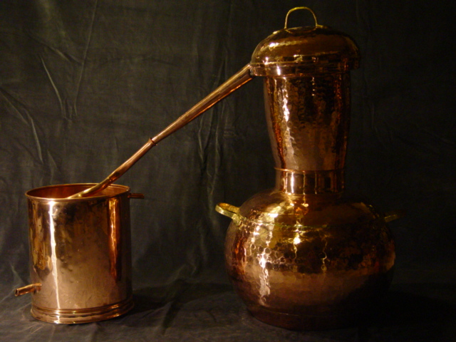 Das Geistrohr ist die gesamte Rohrverbindung zwischen Hut und Kühler, denn dadurch geht der Geist des Destillates. Bei vielen Aromadestillen geht das Geistrohr direkt nach unten geneigt in Richtung Kühler - ideal für eine möglichst hohe Aromaausbeute, denn hier wird sogar eventuell vorher kondensierendes noch sicher in den Kühler geleitet.