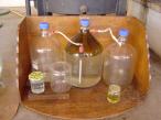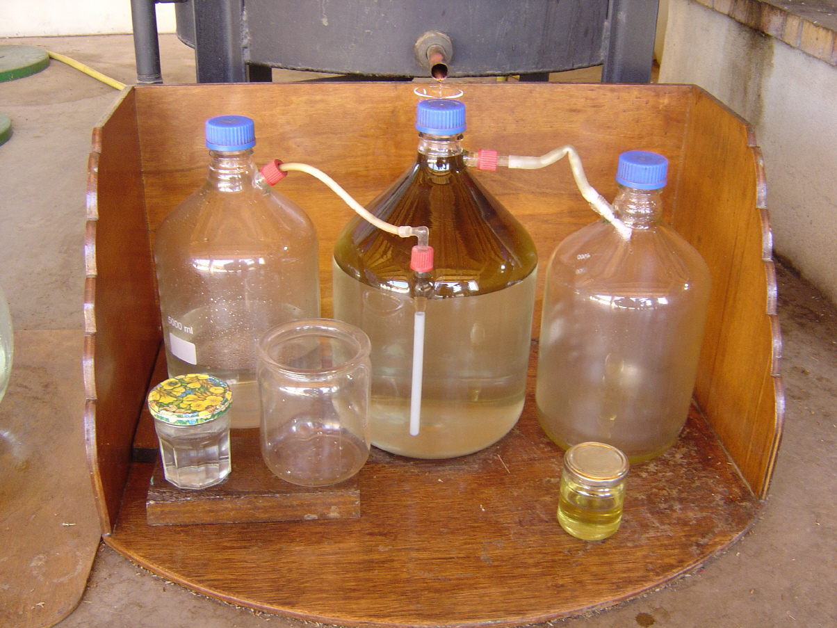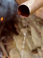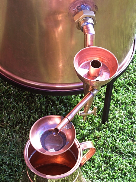 Hier, am Ende der Kühlspirale, tropft unser Destillat schließlich heraus. Der heiße Dampf wurde im Kühler gekühlt und könnte wieder kondensieren. Je nach Art unserer Destille, des Destilliergutes und der Stärke der Befeuerung kann es hier sanft tropfen oder auch schnell heraus rinnen.